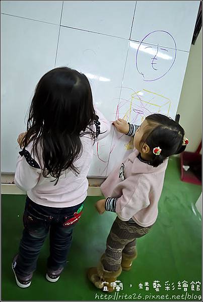 另外兩個女寶也坐不住在那邊塗鴉..反而是對旁邊的大畫板非常感興趣